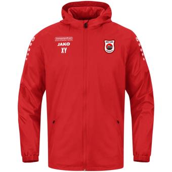 Die JAKO Allwetterjacke Team 2.0 besteht aus 100 % Polyester. Ein hochfunktionelles, wasserabweisendes Obermaterial mit PU-Beschichtung hält dich bei jedem Wetter trocken. Die Kapuze, der verlängerte Rücken und die elastische Binding schützen dich vor Wind und Regen. In den integrierten Seitentaschen mit Reißverschluss kannst Du deine Wertsachen verstauen.